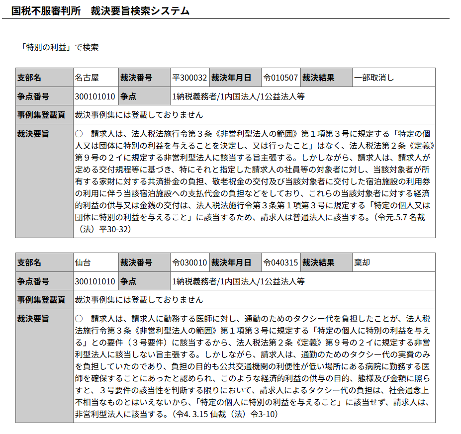 また、国税不服審判所の「裁決要旨の検索」(https://www.kfs.go.jp/cgi-bin/sysrch/prj/web/index.php)において、「特別の利益」をキーワードに検索すると、以下の事案が見つかります。
